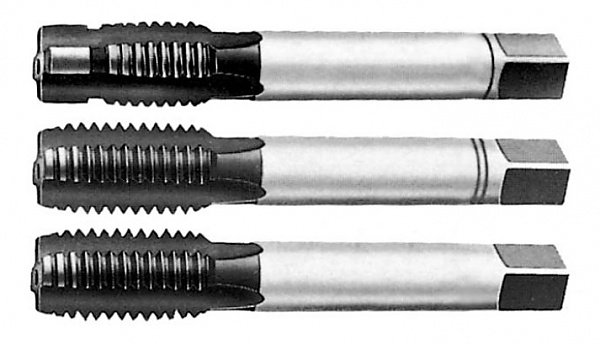Gwintowniki ręczne HSS-E, DIN 352, pole tolerancji ISO 2/6H, typ INOX, bez pokrycia. Przeznaczone do gwintów metrycznych wg ISO DIN 13, szczególne zastosowanie do stali nierdzewnych i kwasoodpornych, przydatne do obróbki stali do 1200 N/mm², aluminium, mosiądzu, brązu, żeliwa i stali do 1400 N/mm². Komplet 3-sztukowy posiada gwintownik wstępny kalibrująco-piotujący z nakrojem A (6-8 zwojów w części wcinającej) pośredni z nakrojem D (3.5-5 zwojów w części wcinającej) i wykańczający z nakrojem C (2-3 zwoje w części wcinającej).