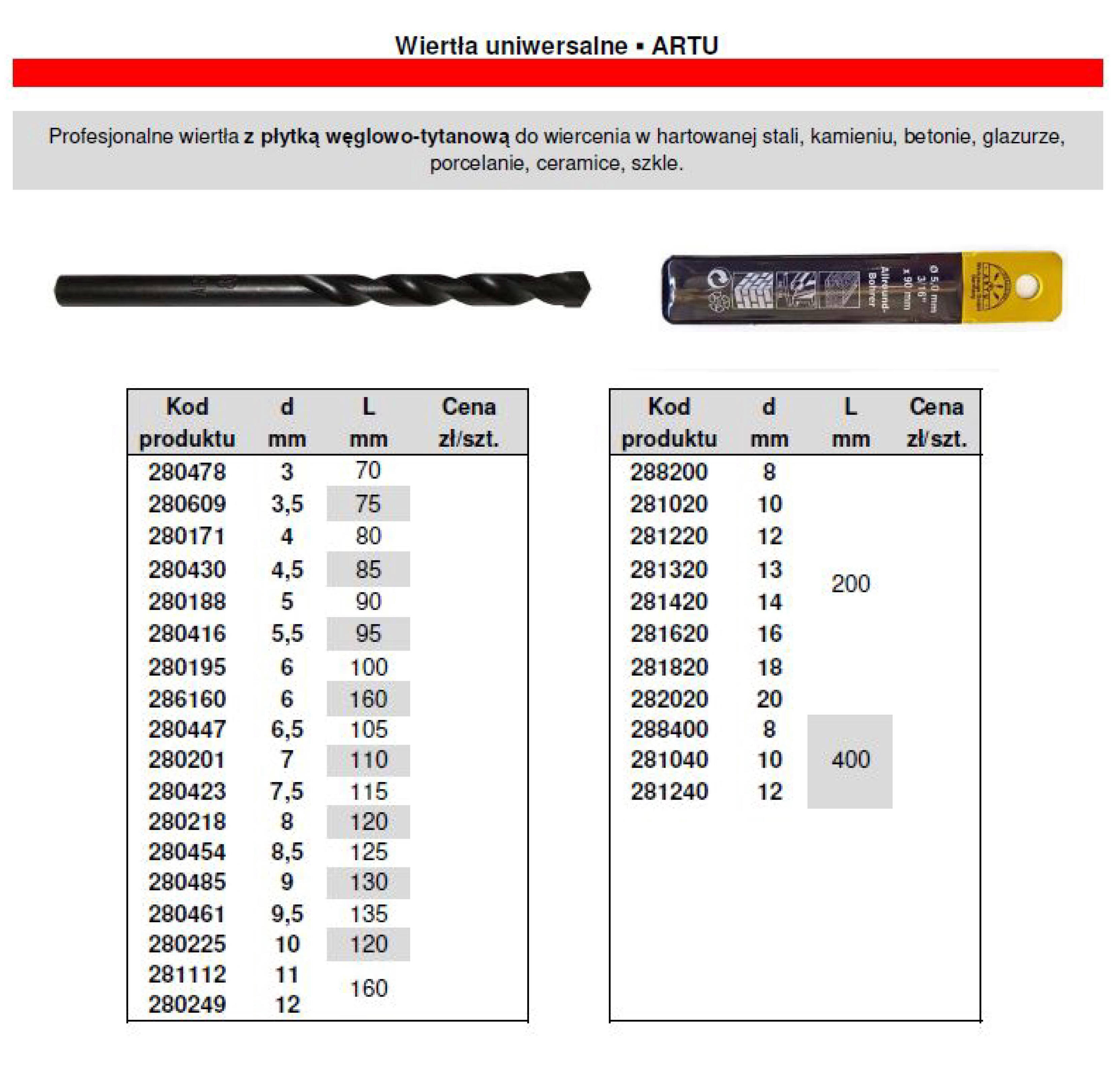 Wiertła profesjonalne z płytką węglowo-tytanową do wiercenia w stali hartowanej, w kamieniu, betonie, glazurze, ceramice, porcelanie, szkle.