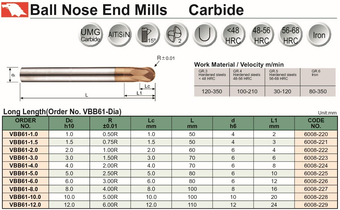 B362-010 6008-220 FREZ WĘGLIK 1.0 Z=2 KULA ALTiN EX <68HRC SZT. 105,19