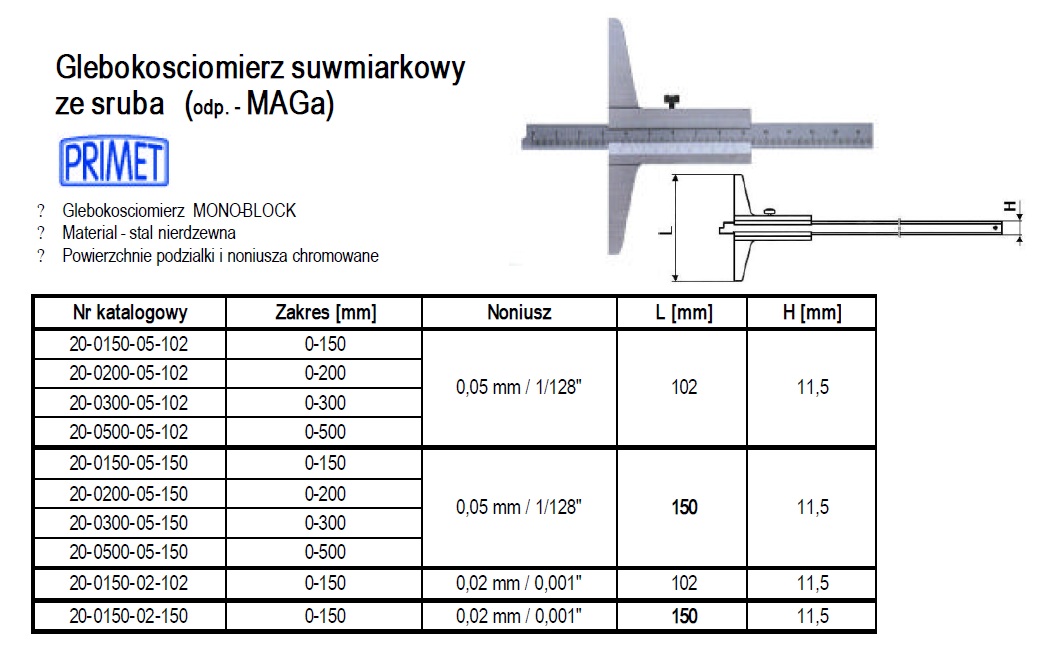 G223-160 20-0500-05-102 GŁĘBOKOŚCIOMIERZ SUWM.MAGa 500/102/0.05 SZT. 131,67