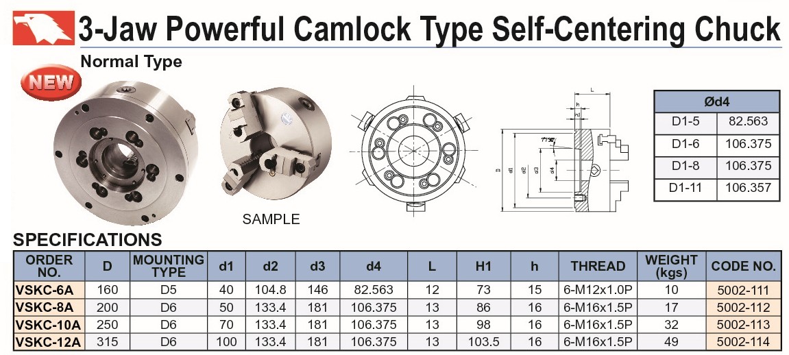 F016-020 5002-111 UCHWYT TOKARSKI 3-SZCZĘKOWY SAMOCENTR. VSKC-6A 160-D5 SZT. 1 110,82