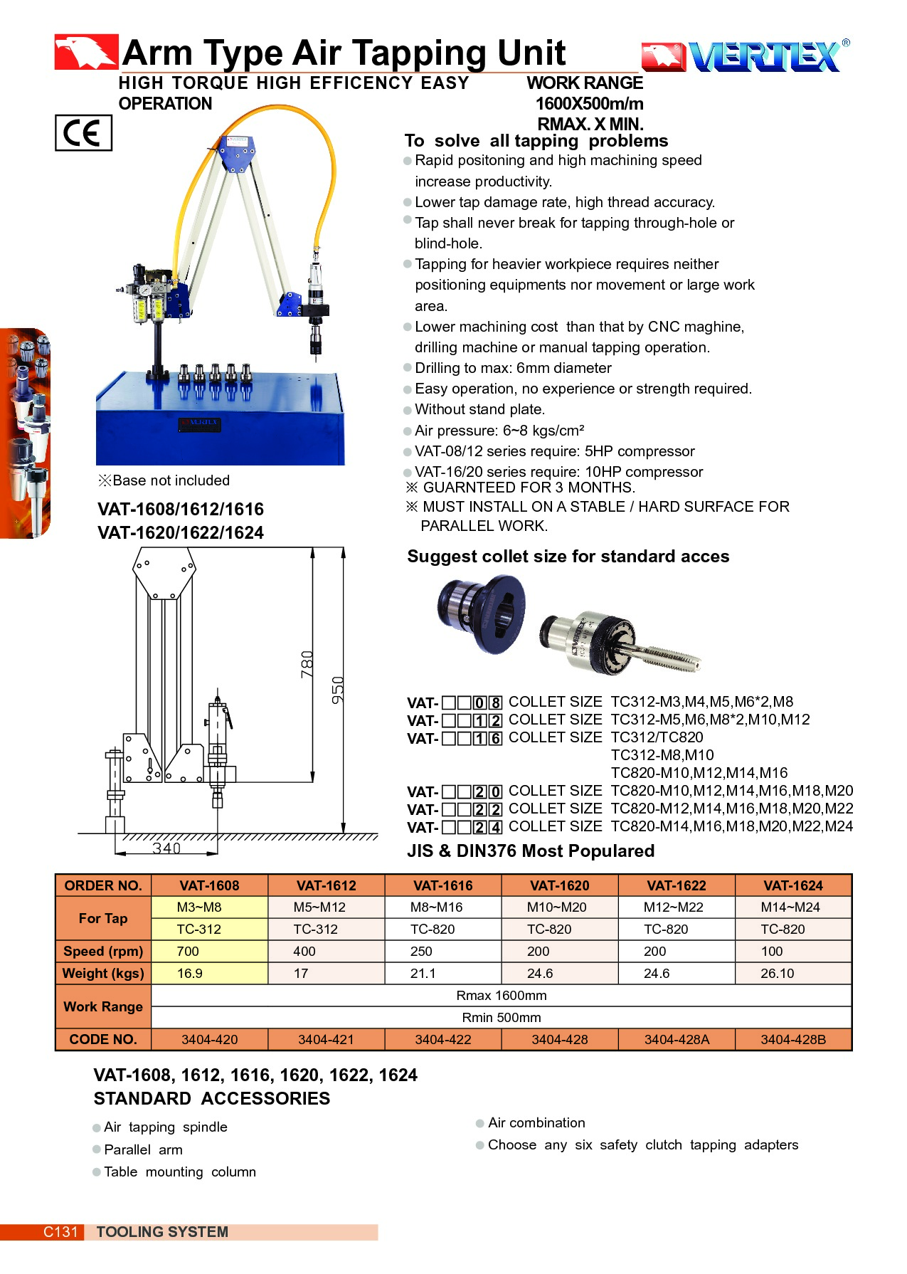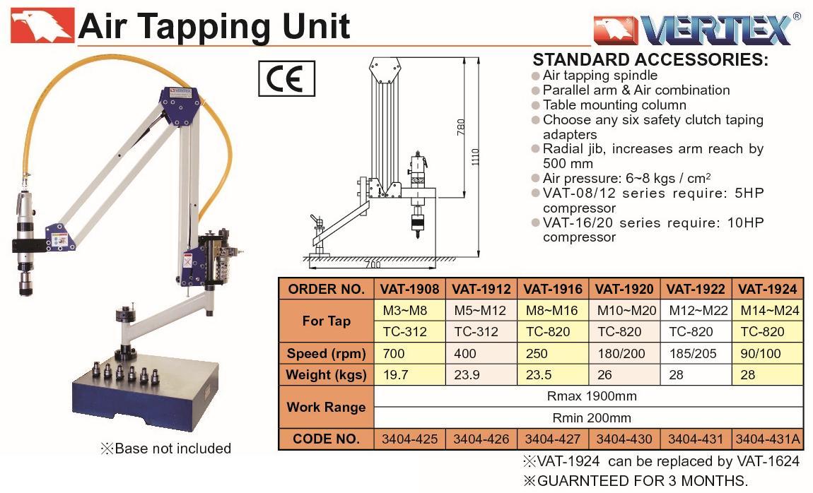Ramię gwintujące firmy Vertex oferuje różne zakresy działania, z maksymalnym rozstawem wynoszącym